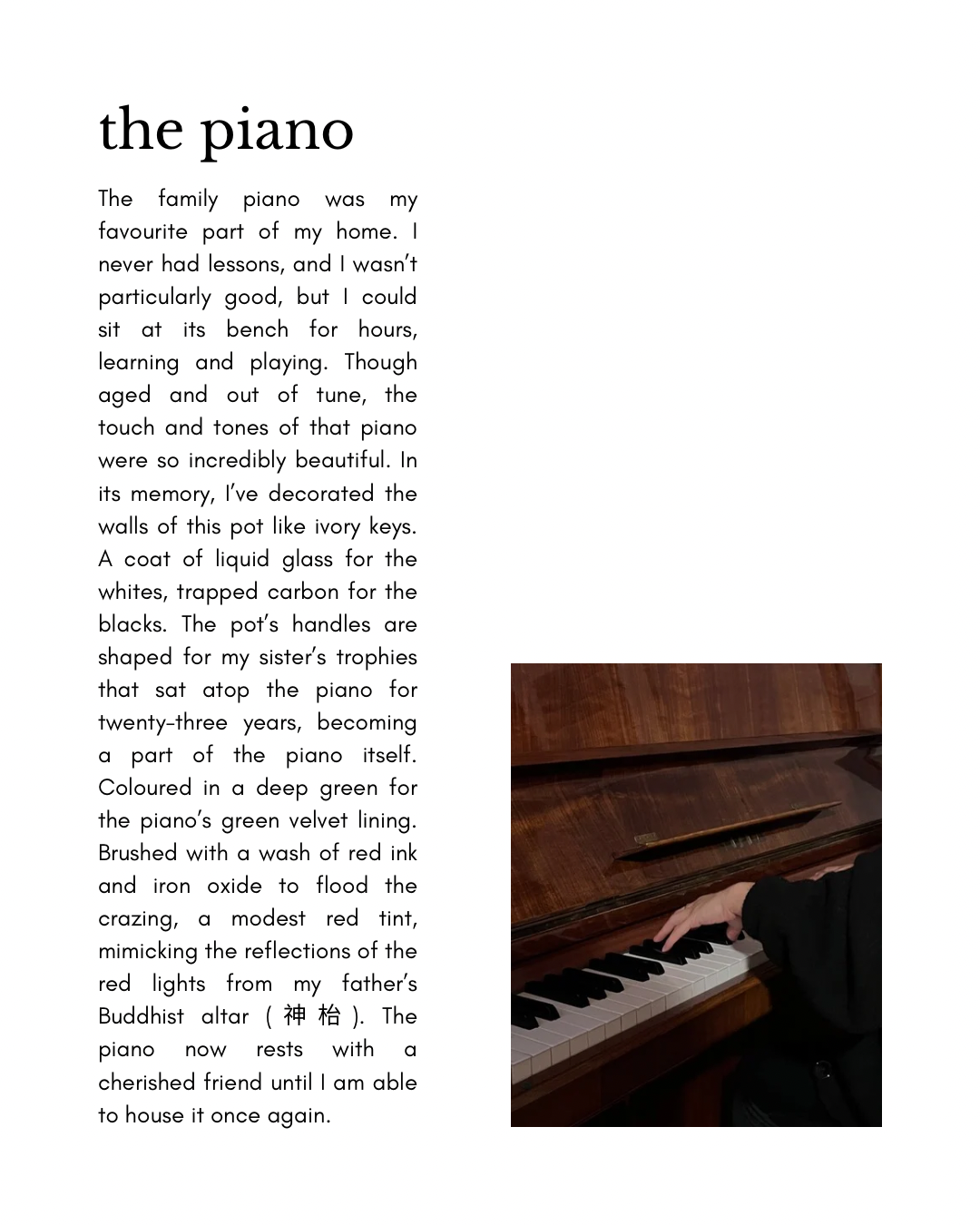 My beloved family piano. The beautiful, and even not to beautiful, music you’ve delivered. Resting in the room closest to the front door, we’d play a song before we left and another when we’d return. My sisters laid on your bench, playing melodies, waiting for my parents to bring me home after I was born. You’ve been there my entire life, and I have always been fascinated by you. One day, you’ll have a place, home with me again. Play you soon.